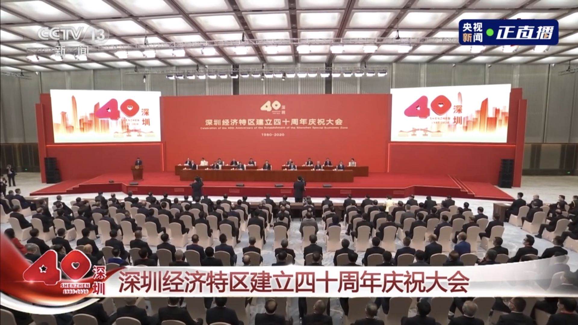 2020年10月14日上午,深圳经济特区建立40周年庆祝大会在深圳前海国际会议中心隆重举行。中共中央总书记、国家主席、中央军委主席习近平等党和国家领导人出席会议。