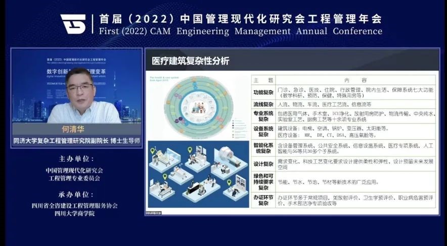 公司总裁何清华教授主题演讲以“中西方医疗创新和技术发展”为切入点,由医学发展对医院建设的启示,提出了系列科学问题的思考:医院建设创新认知、创新工具、创新研发、创新方案,甚至创新颠覆,特别提到医院建筑是一个复杂系统,并对医疗建筑复杂性进行了概要分析。最后,结合公司BIM咨询团队负责的近30个上海市级医院建筑全过程BIM应用实践案例,从全过程BIM应用实施组织模式、集成化服务、BIM的应用发展、BIM策划的价值体现,以及公司信息化平台“漫拓云工程”和基于BIM的后勤智能化运维系统等复杂工程全过程BIM+管理实践进行全面、系统性分享。