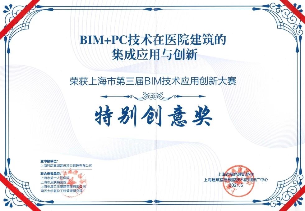 由上海市住房和城乡建设管理委员会、上海市绿色建筑协会、上海建筑信息模型技术应用推广中心共同举办的上海市第五届BIM技术应用创新大赛经过多轮评审,最终产生项目案例奖99项、特别创意奖24项、优秀个人奖30项。我司BIM团队联合申报项目上海交通大学医学院附属瑞金医院北部院区二期扩建工程、上海市精神卫生中心重性精神疾病临床诊疗中心项目分别斩获房项目案例奖房建类一等奖、三等奖。800床全负压应急医学中心平疫结合BIM实施方案、国家级口腔医学中心BIM+医疗工艺成套应用技术和BIM+安全、高效、韧性MDT诊疗模式的技术方案获特别创意奖一等奖。