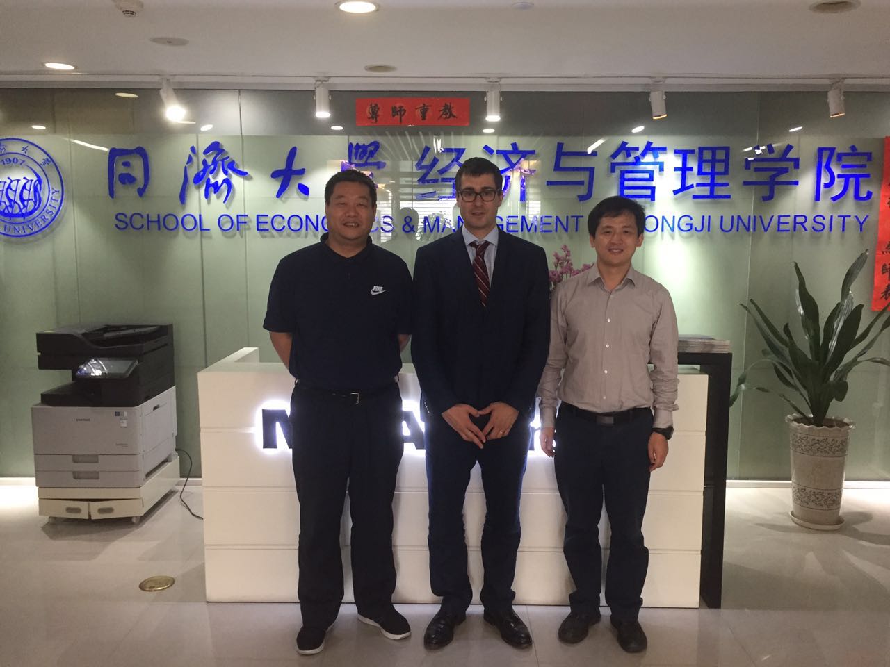 7月6日上午9:30,Locatelli博士(左2)首先到访我司和复杂工程管理研究院,与乐云教授(右2)和李永奎教授(右1)进行了友好和亲切交谈,之后Locatelli博士于同济大学经济与管理学院306教室进行了主题为“What’s make a megaproject successful”(大型项目成功因素)的讲座,演讲约持续1个小时,经济与管理学院的20余位硕士、博士研究生以及少数年轻教师参加了讲座。Locatelli博士风趣幽默,演讲生动,大家反响也十分热烈。演讲结束后,Locatelli博士受邀与施骞教授(院长助理、MBA中心主任,左1)会面,双方主要就两校未来学术交流与合作、MBA培养状况等方面进行了探讨。