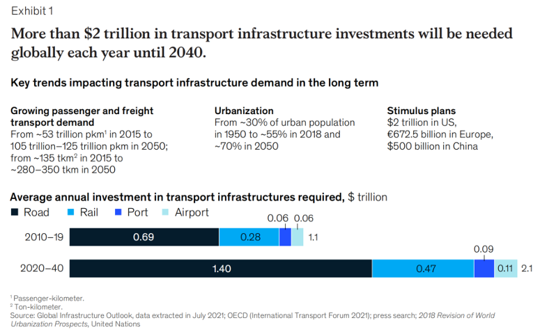 交通基础设施投资的一个主要驱动力是快速且持续的城市化步伐。此外,为减轻疫情留下的“经济残骸”,世界各国政府推出大量基础设施组成的刺激性计划(例如中国启动了一项5000亿美元的财政刺激计划以促进基础设施投资)。