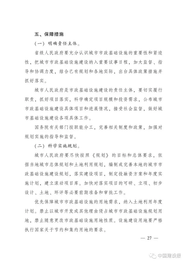 《规划》指出,城市人民政府作为市政基础设施建设的责任主体,要切实履行职责,编制或完善本地的城市市政基础设施建设规划,做好城市基础设施建设各项具体工作。并从明确责任主体、科学实施规划、保障资金投入、加强科技支撑、强化监督管理等五个方面提出了《规划》实施的保障措施。