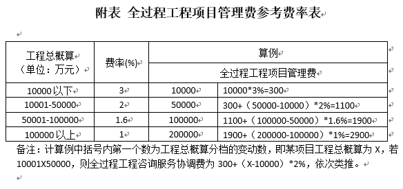 “1”是指“全过程工程项目管理费”,即完成本指引项目决策、勘察设计、招标采购、工程施工、竣工验收、运营维护六个阶段“全过程工程项目管理”的服务内容后,投资人应支付的服务费用。本指引建议的“全过程工程项目管理费”的参考费率如附表B所示。