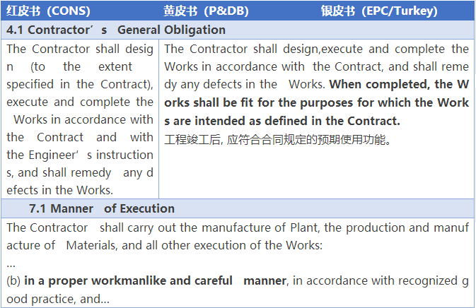 有时候,虽然合同并未明确规定,通过一些既定事实,法院可能会发现满足使用功能这样的责任符合双方签订合同时的客观意图,从而判决合同事实上包含了这样的默示条款。虽然在工程总承包模式下承包商很容易承担满足使用功能的严格责任,但是法院也不会轻易去推翻合同的相反规定。也正应为如此,当前国际上知名的标准合同文本,特别是基于英美法编纂的合同,大多对此做出了相对明确的规定。所有任何时候都需要去看看合同的具体规定再来探讨责任问题。