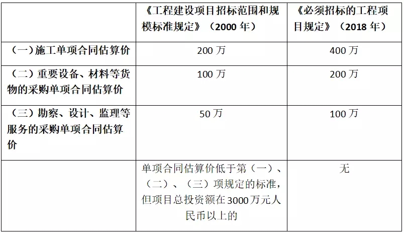 与2000年开始施行的《工程建设项目招标范围和规模标准规定》相比,必须招标的项目施工单项合同估算价从200万提至400万,重要设备、材料等货物的采购,单项合同估算价从100万提至200万,勘察、设计、监理等服务的采购,单项合同估算价在则从50万提至100万元人民币,并且取消了原规定中“单项合同估算价低于第(一)、(二)、(三)项规定的标准,但项目总投资额在3000万元人民币以上的”这一要求。